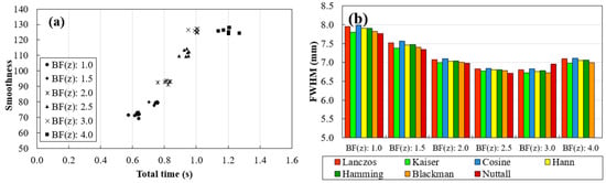 Results obtained with Lanczos, Kaiser, Cosine, Hann, Hamming, Blackman, and Nuttall window functions for the profile at 90°, by changing BF(z) values (from 1.0 to 4.0). (a) Smoothness values as a function of total time and (b) FWHM of the 5.0 mm disk at 90°.
