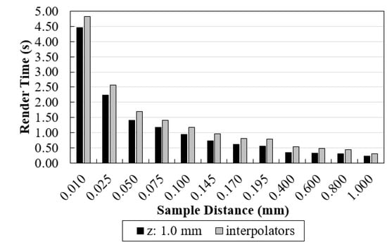 For each sampling distance, the time required to render the original data (z: 1.0 mm, black in Figure 9) was recorded. In addition, the average rendering times of each selected interpolator (cubic, Hamming with WHW = 5, Hamming with BF (z) = 2 and Hamming with WHW = 5 and BF(z) = 2) were also calculated (gray in Figure 9).