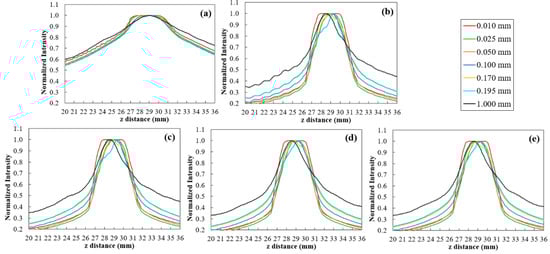 Profiles of the 5.0 mm disk obtained at 90°, for some values of sampling distance tested (0.010, 0.025, 0.050, 0.100, 0.170, 0.195, and 1.0 mm), with the original data (a) and after rescaling with cubic (b), Hamming with WHW = 5 (c), Hamming with BF (z) = 2 (d), and Hamming with WHW = 5 and BF (z) = 2 (e).