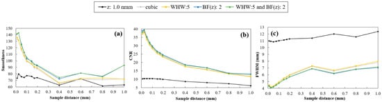 Smoothness (a), CNR (b) and FWHM (c) plotted as a function of sampling distance values for original data and data after interpolation with cubic, Hamming with WHW = 5, Hamming with BF (z) = 2 and Hamming with WHW = 5 and BF (z) = 2. Results obtained for rendered images at 90°.