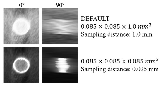Summary of the results obtained for phantom at 0° and 90°, with default visualization options (voxels with 0.085 × 0.085 × 1.0 mm3 and sampling distance 1.0 mm) and the options selected in our study (voxels with 0.085 × 0.085 × 0.085 mm3 after interpolation with Hamming window function and BF (z) = 2 and sampling distance 0.025 mm).