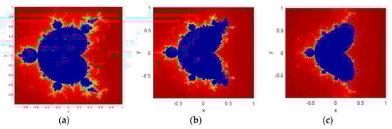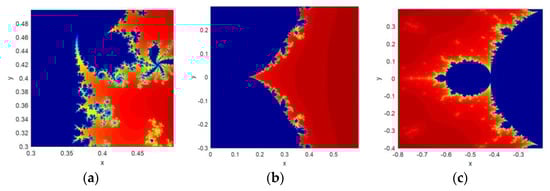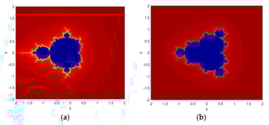 A Mandelbrot fractal function was invented by B.B. Mandelbrot in 1982 [] while analyzing the topology of the famous Julia set function. According to him, a simple mathematical function can create the theory of self-similarity and roughness by generating the complex fractal images. The Mandelbrot set (MS) can be defined as a set of values in the complex plane for which the orbit of 0 remains bounded under iteration of the given function.