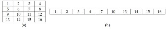 - Apply Z-scan to and select any 256 values to get a one-dimensional fractal data vector of size 1 × 256. The Z-scan process can be described using a sample matrix of size 4 × 4 as shown in Figure 7.