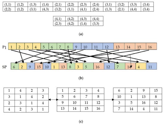 Scrambling process example using 4 × 4 matrix. (a) Actual pixel position and its corresponding shuffled pixel position; (b) pixels mapping between P1 and SP; (c) Matrix view of the scrambling process using S, P1 and SP respectively.