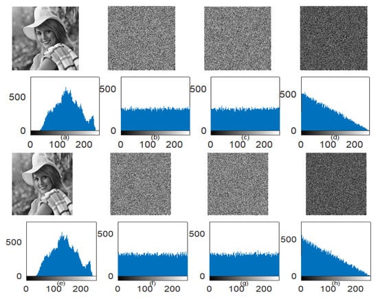 (a–d) Encryption sensitivity using the image and its histogram, (a) Elaine image; (b) Encrypted image using correct secret key; (c) Encrypted images using modified secret key; (d) Image difference between encrypted images using correct and modified secret key (e–h); Decryption sensitivity using an image and its histogram; (e) Decrypted images using the correct secret key; (f–g) Decrypted images using two different modified secret keys; (h) Image difference between decrypted images using two different modified secret keys.