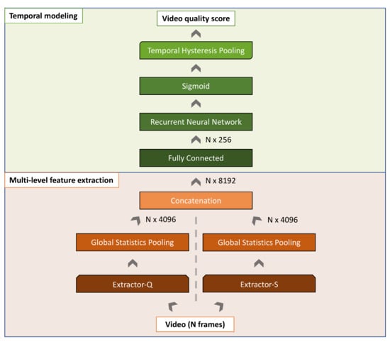 The proposed method we called Quality and Semantics Aware Video Quality Method (QSA-VQM) is depicted in Figure 1. It estimates the quality score of RGB video sequences of variable resolution and length. It consists of two main blocks: the Multi-level feature extraction block and the Temporal modeling block. In the Multi-level feature extraction block, video frames are fed one at a time into two Convolutional Neural Networks (CNNs), called Extractor-Q and Extractor-S, in which the aim is to compute quality and semantic features for each video frame. These features are concatenated and then processed by the Temporal modeling block, which involves a Fully Connected (FC) layer for dimensionality reduction, and a Recurrent Neural Network (RNN) layer [31,32], which predicts a quality score for each frame also taking into account previous frames. The quality score for the whole video is finally obtained by applying the Temporal Hysteresis Pooling proposed in [11] on the scores previously predicted for video frames. In the next sections we detail each block of the QSA-VQM.