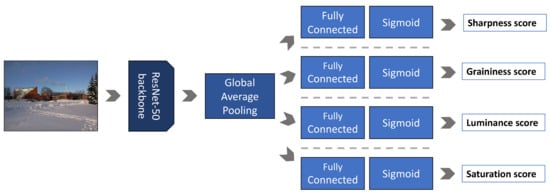 In Figure 2 we show the architecture of the Extractor-Q. It consists of a ResNet-50 [35] architecture (given its good trade-off between performance and number of parameters [36]) truncated to the last convolutional layer, then a Global Average Pooling (GAP) layer that is followed by four different Fully Connected (FC) layers. The sigmoid activation function is finally applied to each output layer because we want predicted scores to lie in the range according to MOS. The Extractor-Q is end-to-end trained in a multi-task fashion for simultaneously estimating sharpness, graininess, lightness, and color saturation of images. To train the Extractor-Q we use the CID2013 database [37], which consists of 480 images captured by 79 different cameras of varying quality. Each image is annotated by human subjects in terms of overall quality and four attribute scales (i.e., sharpness, graininess, lightness, and color saturation). During training, the input images are not resized before feeding into Extractor-Q so that the network is trained on images having the same resolution as that used for collecting annotations. The resize of the image could in fact introduce interpolation artifacts.