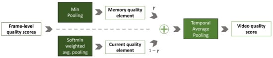 Temporal Hysteresis Pooling [11]. This pooling layer addresses the problem of overestimating the quality of videos. Specifically, a Memory quality element is defined as the minimum of the quality scores over the previous frames, while a Current quality element is defined as a sort-order-based weighted average of the quality scores over the next frames. The approximate score is then calculated as the weighted average () of the Memory and Current elements. The overall video quality is finally computed as the temporal average pooling of the approximate scores.