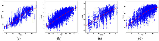 Scatter plots of the predicted scores versus MOS for the four considered databases: (a) CVD2014, (b) KonViD-1k, (c) LIVE-Qualcomm, and (d) LIVE-VQC.
