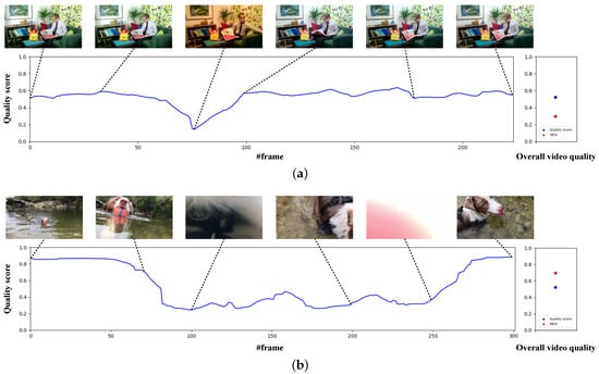 (Best viewed in colors and magnified.) Visualization of two samples of video quality overstated or undervalued by the proposed method: (a) sample video from CVD2014, and (b) video sequence of the LIVE-VQC database. On the left we show the frame-level predictions obtained before the Temporal Average Pooling of the Temporal Hysteresis Pooling layer, while on the right we report the overall video quality MOS and the corresponding predicted score.