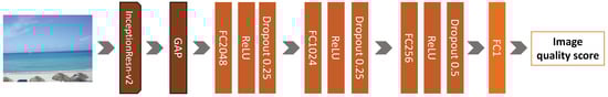 About the choice of the extractor for our VQA model, we experiment by changing only the extractorQ with a CNN trained on an image quality assessment dataset, named KonIQ-10k [44], while keeping all the components of the Temporal modeling block. The original model outperforms state of the art in IQA on the KonIQ-10k and the LIVE in the Wild [45] databases. The CNN architecture of the Koncept512 is shown in Figure 7 and consists of an InceptionResNet-v2 [46] head network followed by a Global Average Pooling (GAP) layer, and four Fully Connected (FC) layers, the aim of which is to assign a quality score to each image. We retrain the previous model by using the same hyper-parameters of [44], and the provided dataset split. On the test set images of KonIQ10k, we obtain a PLCC score equal to 0.8797, 0.8588 of SROCC, KROCC equal to 0.6730, and 8.0329 of RMSE after 25 epochs of training. To use the Koncept512 as Extractor-Q of our QSA-VQM, we truncate the architecture to the last convolutional block and then add a GSP layer to obtain the quality features as also explained in Section 2.1. The results obtained on three of the considered databases are presented in Table 6.