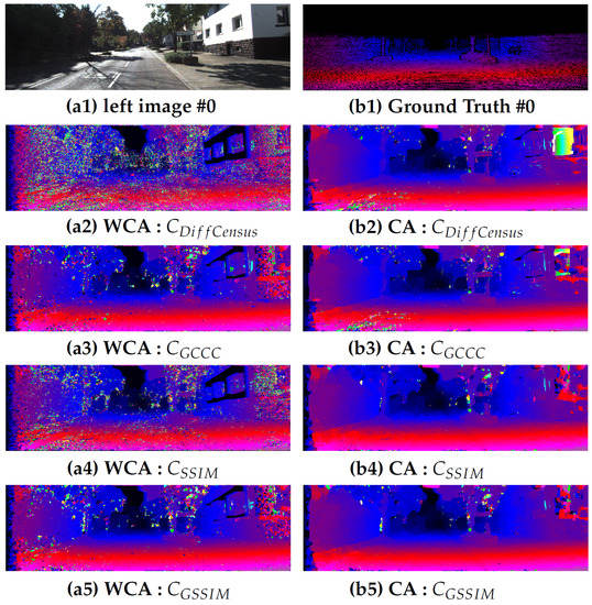 Disparity maps of stereo pair from the KITTI 2012 dataset. The first column corresponds to left stereo (a1) with its corresponding ground truth disparity map (b1). The computed disparity maps are listed in the following lines corresponding to cost functions , , and , respectively. First column (a) correspond to the output obtained without the use of an aggregation method (WCA), while second column (b) are the output based on the adaptive aggregation method (CA).