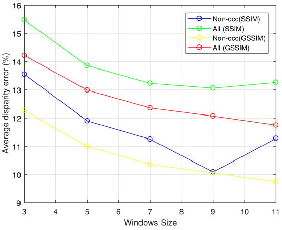 The effectiveness of the proposed method was firstly evaluated with respect to the support window size on KITTI 2012 training datasets. Figure 2 presents the mean error rate, in both non-occluded and all regions, computed at the default 3 pixels threshold for all of training set images. It can be noted that the size of the support window impacts highly the performance of the algorithm of both cost functions. Indeed, significant improvement in the performance of the local stereo matching algorithm can be obtained as the size of the support window increases. More precisely, the improvement is by a factor of for the non-occluded and by for occluded zones, for the cost function when the size window passed from 3 to 5, for example.