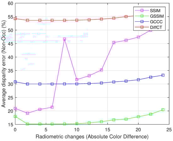 In this section, we study the impact of radiometric distortions on different cost functions. These distortions are generated while using the absolute color difference between corresponding pixels []. At each level of radiometric distortion, we compute the mean disparity errors for all KITTI training set for , , [], and [] cost functions. It can be visualized from the Figure 3 that the proposed cost give the lowest error rate at all radiometric distortion levels.