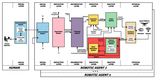 Aerostack system architecture [34]. The reader must note the importance of the situational awareness system (colored in red).