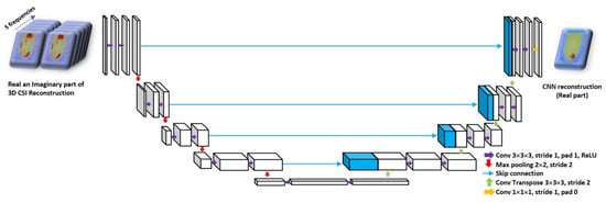 The desired mapping for our task at hand is an image-to-image transformation; there are multiple neural architectures that can implement this mapping. For instance, a naive choice could be a fully-connected single layer neural network which takes in CSI reconstruction as input and is trained to output the ground truth permittivity. However, such an architecture would be very prone to overfitting []. We, therefore, use a hierarchical convolutional neural network for our image-to-image transformation task. A good template for such a task is the U-Net architecture which is one of the most successful deep neural networks for image segmentation and reconstruction problems []. The architecture consists of successive convolutional and downsampling layers, followed by successive deconvolutional and upsampling layers. Moreover, the skip connections between the corresponding contractive and expansive layers keep the gradients from vanishing that helps in the optimization process [,]. To use a U-Net for reconstruction, the original objective of the U-Net is replaced with the sum of pixelwise squared reconstruction errors between the true real part of permittivity and the output of U-Net []. In our problem, the network input is the 3D CSI reconstructed complex images (after 500 iterations). Thus, there are two options for choosing the U-Net architecture, U-Net with complex weights and U-Net with real weights. Very few studies have been done on the training of U-Net with complex weights, although very recently Trabelsi et al. tried to train the neural network with complex weights for convolutional architectures []. In this paper, we decided to use a U-Net architecture having real-valued weights. A schematic representation of our architecture is shown in Figure 2. The motivation for choosing the neural network parameters (the number of convolutional layers, size and number of filters) is as follows. In a hierarchical multi-scale CNN, the effective receptive field of the convolution filters is variable at each layer, i.e., through successive sub-sampling it is possible to have a larger receptive field even by using filters of smaller kernel size [,]. As mentioned above, the input to our neural network is ; in particular, for each frequency, the dimension of our input image volume is (i.e., ). If we start with a 3D receptive field of , after four layers of successive convolutions and subsampling (by a factor of 1/2), the receptive field would effectively span the entire image volume. We, therefore, use four convolutional layers with a 3D filter kernel size of . Since after each convolutional layer the size of the image volume is reduced, we can increase the number of filters at each successive layer to enhance the representational power of the neural network []. In particular, we start with 32 filters for the first layer and successively double the number of filters after each layer (number of filters after the fourth layer is 512). This defines the encoder part of the U-net i.e., the part of a neural network consisting of contractive convolutions. For the decoder part, we follow a symmetric architecture consisting of expansive convolutions [].