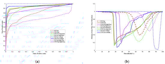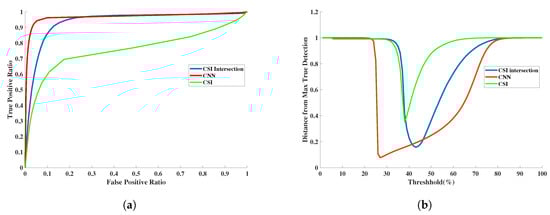 The detection performance using the reconstructed outputs of the Convolutional Neural Network (CNN) and CSI as well as the intersection of CSI reconstructions at the five chosen frequencies. (a) Receiver Operating Characteristics (ROC) curves derived from the reconstructions. (b) The DMTD curve.