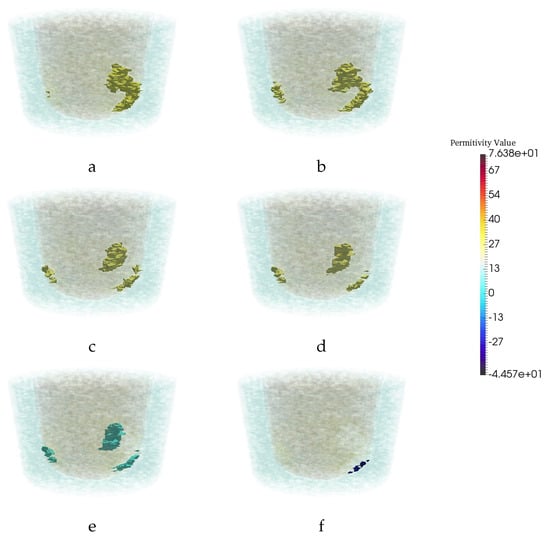 CSI reconstructions at four remaining frequencies for the same example as in Figure 4 and resulting images after intersecting images thresholded at 85% of the maximum reconstructed permittivity. (a–d) The real part of CSI reconstructions at 1.2, 1.3, 1.4, and 1.5 GHz. (e) Intersection of real part of CSI reconstructions. (f) Intersection of imaginary part of CSI reconstructions.