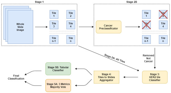 The idea behind this work is to build a system that mimics the actions a pathologist performs when detecting the presence of the HER2 receptor. The actions include to divide each slide into tiles under the “divide et impera” principle, filter the tiles in order to keep only the most informative ones for the purpose of HER2 detection (i.e., only the tiles containing cancer), check for the presence of HER2 into the individual tiles, and finally aggregate the tile information at the slide level to perform the decision whether the whole slide expresses or not the HER2 receptor.