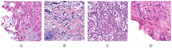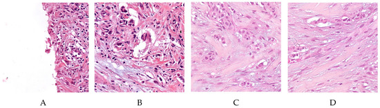 Tiles identified by the cancer classifier as: positive (first two tiles, tile (A) is a true positive, tile (B) is a false positive), and negative (last two tiles, tile (C) is a true negative, tile (D) is a false negative).