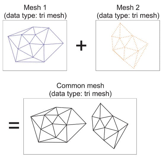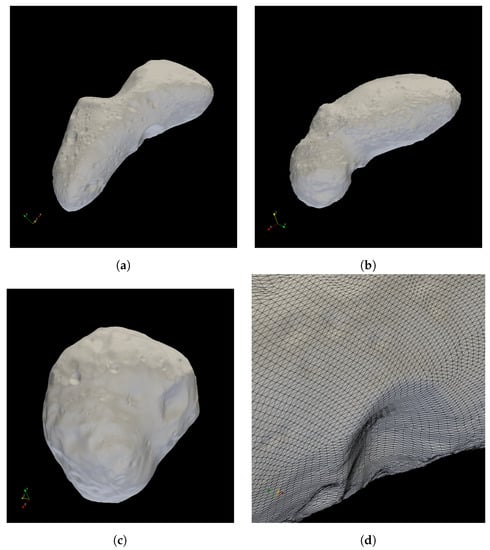 Surface triangulations of small bodies Eros, Itokawa and Phobos. Average edge lengths are calculated from the average triangle area, assuming equilateral triangles. Thus, the values for average edge lengths are of a correct order of magnitude. (a) Asteroid (433) Eros. 196,608 faces, average triangle area 5771 m2, average edge length approx. 115 m []; (b) Asteroid (25143) Itokawa, 196,608 faces, average triangle area 2 m2, average edge length approx. 2 m []; (c) Martian satellite Phobos, 49,152 faces, average triangle area 33,500 m2, average edge length approx. 278 m []; (d) close-up of triangle patches on Eros’s surface, average triangle area 22,982 m2, average edge length approx. 230 m [].