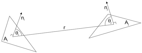 Given triangles #i and #j, let and be the angles between the respective outer normal vectors and the line connecting the centers of gravity of the two triangles. Let r be the distance of the cog’s. We consider the triangles small w.r.t. to the surface of the small body (typically, the surface is patched with a couple of thousand triangles) as well as plane (this is trivial). Thus, integration over the triangle surfaces is not necessary and the following simplified form of the form factor calculation can be used (see Figure 6):