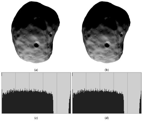 Figure 7a,b show illumination conditions (irradiances) on the Martian moon Phobo (approx. 49k surface triangles). Figure 7c,d show the corresponding image histograms. Note that effects of multiple scattering can be visible on the concave part on the surface only, and this applies in particular to crater slopes. A perfect sphere would show no difference for multiple scattering toggled on or off.