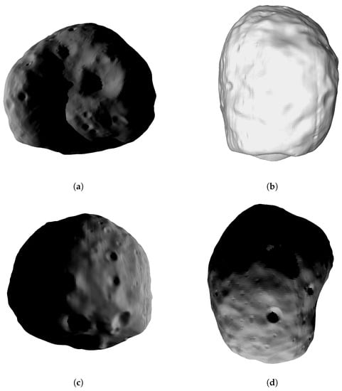 Solar illumination of Martian moon Phobos, showing realistic shadowing in different angles of view. (a) Phobos [], solar radiation from the left-hand side; (b) Phobos [], solar radiation from the front (directed into image plane); (c) Phobos [], solar radiation from the right-hand side; (d) Phobos [], solar radiation from the bottom.