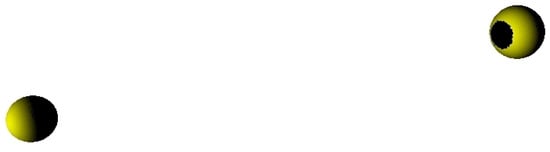 The Pluto–Charon binary system has been considered as a second example. Idealized positions of Pluto and Charon have been assumed, i.e., both bodies on the x-axis, separated by the real average distance of 19,596 km. Radii are 1187 km and 606 km for Pluto and Charon, respectively. Figure 12 shows the shadow casted by Charon on Pluto’s surface, assuming the sun in direction (1,0,0).