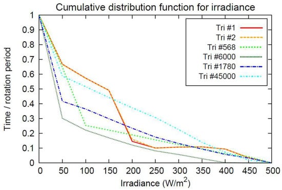 Cumulative distribution function for the irradiance at different points (triangle patches) on Phobos’ surface, relative to being Phobos’ spin period, i.e., 7.65 h. is shown, see Equation (15) for five different triangles