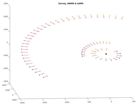 DAWN S/C positions relative to 4 Vesta during the survey, HAMO and LAMO phase. Orientations of the camera (FC 2) are shown as red arrows, and the color of each dot represents time during each mission phase from yellow (early) to blue (later) [].