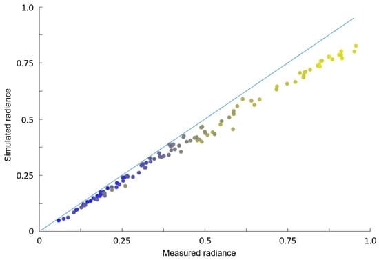 Figure 17 shows the correlation between simulated and measured radiance for image ID FC21B0007807-26232214089F1B.FIT (compare Figure 18. It can be observed that systematic deviation occurs for high solar zenith angles, indicating systematic deviations of the BDRF especially for shallow illumination conditions.