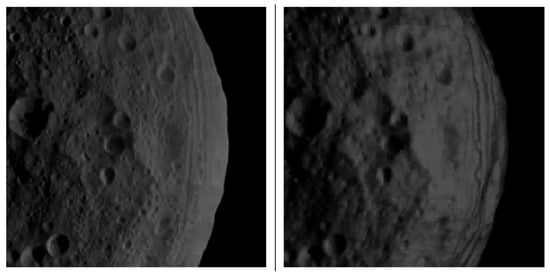 Left: real image as acquired by the DAWN Framing Camera FC2. Right: simulated image, 196608-triangle-model of Vesta with 1024 × 1024 px camera resolution. Image ID FC21B0005907- 11232212051F1B.FIT, .