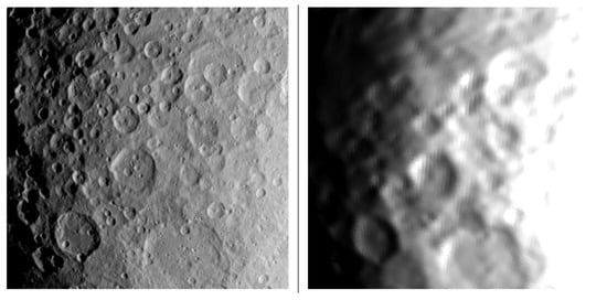 Left: real image as acquired by DAWN Framing Camera FC2. Right: simulated image, 196608-triangle-model of Vesta with 1024 × 1024 px camera resolution. Image ID FC21B0007807- 26232214089F1B.FIT, .