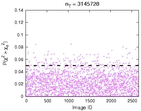 This test is done for every picture and for every resolution available for the Vesta surface grid (see Table 1). As can be seen in Figure 22, the majority of the test cases yield values of , i.e., the null hypothesis is rejected. Note that the null hypothesis is actually that the underlying RPDF of the acquired and simulated images are different. Thus, the reliability of the algorithm is good.