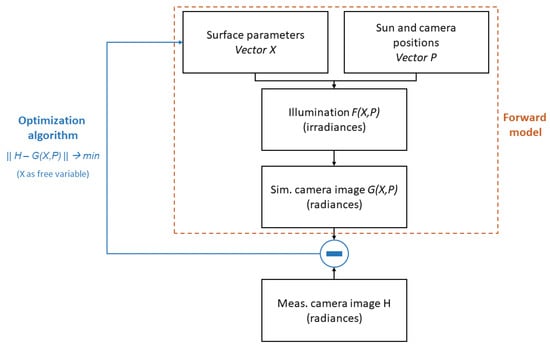 Algorithmic scheme for parameter estimation. The inversion should be done with a large amount of images to increase. The overall method is modular, that is, e.g., the optimization algorithm can be replaced by another one. In addition, the tool for generation of illumination conditions as well as that for camera images can be replaced by another one, as long as all interfaces are maintained.
