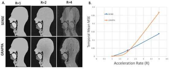 - Griswold, M.A.; Jakob, P.M.; Heidemann, R.M.; Nittka, M.; Jellus, V.; Wang, J.; Kiefer, B.; Haase, A. Generalized Autocalibrating Partially Parallel Acquisitions (GRAPPA). Magn. Reson. Med. 2002, 47, 1202–1210. [Google Scholar] [CrossRef]