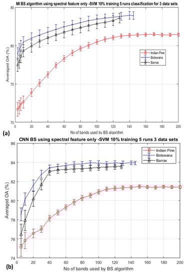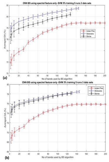The mean classification accuracy of the Convolutional Neural Network (CNN) BS algorithms as a function of the number of bands used for the classification of the same datasets as in Figure 2 but with reduced training data to (a) 5% per class and (b) 3% per class. The trend of increasing the accuracy with the dimensionality under such a small amount of training data may suggest that it is not the ‘over-sufficient’ amount of training data that has been utilized here for causing the absence of the Hughes’ accuracy-dimensionality characteristic in these experiments.