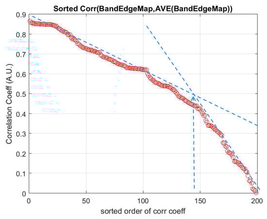 The Corr(.) is the correlation function, and an abrupt change of Ci will give an indication of the threshold boundary between the highly structured and the featureless morphological maps. In this work, all bands below this threshold are reassigned to the bottom of the selection list, and the highly structured bands are then passed onto the next stage of spectral processing. The validity of this formulation is more applicable to high-quality datasets (i.e., high signal-to-noise ratio) of scenes with a very small portion of low reflectance objects such as water or hard shadows.