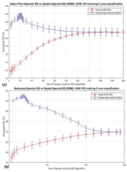 As outlined in Section 2 (Method and Materials), that spatial information has been regarded as an added advantage for the remote sensing data analysis, especially in applications related to ground-use classification. This section is devolved to the understanding of the result obtained from the previous Section 3.1 and with a view to giving more insight into the query of why the Hughes′ accuracy-dimensionality characteristic has hardly been observed from the present results, and neither has it been ever reported in the remote sensing literature. In the previous Section 3.1, it is suggested that the effectiveness of the BS may be one of the issues responsible for observing the results shown in Figure 2 and Figure 3. Thus, in this section, other techniques such as the use of spatial features for improving the effectiveness of band selections, and subsequently the enhancement of classification efficiency of hyperspectral data analysis, are studied here.