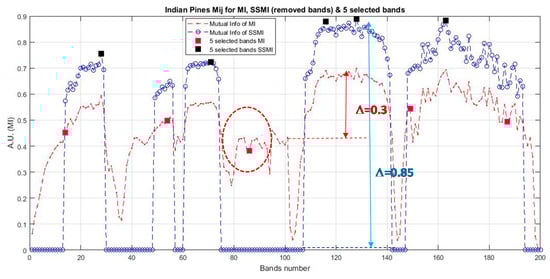 Depicts the I(A, B) of the bands of the Indian Pines dataset given by the MI (red plot) and SSMI (blue plot) BS methods. Note that the SSMI that utilizes both spatial and spectral information enhances the contrast of the I(A, B) by as much as approximately 200% in comparison to the basic MI BS without spatial preprocessing.