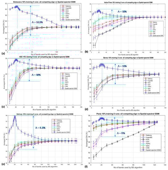 The classification performances of the proposed SSMI and seven other competing algorithms for the classification of 6 datasets (a) Botswana, (b) Indian Pines, (c) KSC, (d) Barrax, (e) Salinas, and (f) Pavia University. In all cases, the training data sizes were kept at 10% per class and every data point involves 5 repeated experimental runs. The averaged enhancement of the classification by the proposed SSMI with respect to the mean of the 7 competing algorithms over 6 datasets at the selected bands of 20 is approximately 10.5%.