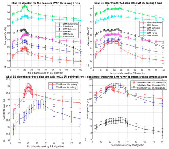 The Hughes analysis indicates that the peak accuracy varies with the number of the training sample. The OA of all datasets that have been classified by SVM using 10% and 3% training data are shown in Figure 8a,b respectively. It is clear that the centers of the peak accuracies for the classification using 3% training data (Figure 8b) have been shifted rather significantly with respect to that of the 10% training. The shift of the peak accuracy can be seen better in Figure 8c,d, where the OA of the Pavia and Indian Pines datasets classified by SVM (and KNN) using the 10% and 3% training data are overlaid together for better visualization of the shift of the classification accuracy peak. The shift of the peak in the Indian Pines data set (Figure 8d) is consistent with all the subplots presented in this figure, and it is noted that there is a subtle difference between the SVM and the KNN result.