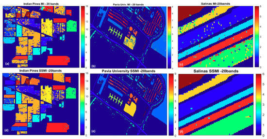 To understand further how the SSMI enhances the classification accuracy, Figure 9 and Figure 10 display the false color classification maps of 3 randomly chosen datasets (Indian Pines, Pavia University, and the Salinas), which have been processed through the MI and the proposed SSMI BS schemes. The presented classification maps are the results for the selected bands of 20 where the peak of the accuracy occurs. Figure 9 displays the classification result of the complete scene, while the zoom-in of the classification maps that highlights the enhanced classification ability of the SSMI is presented in Figure 10. It is quite clear from both figures that the classification capability of the SSMI is over 10% (see Figure 5 above) better than the counterpart MI algorithm, which only utilizes spectral information for band selection.