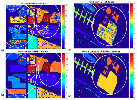 The zoom-ins of the false color classification maps in Figure 9 to highlight the substantial reduction of classification false alarms in the classes (circled) when the bands are selected through the SSMI BS method. Left column (a,c): Portion of Indian Pine, Right column (b,d): Pavia University dataset. The classification results using bands selected by the MI BS (Upper panel) and those proposed by the SSMI BS scheme (Lower panel).