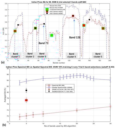 According to the results presented in the last section, it is clear that the elimination of the non-discriminative bands are essentially important for enhancing the classification accuracy. It is also observed that not only the elimination of counter-productive bands is critical, the method for the selection from the ensemble of informative bands is also important, too. As an example, Figure 11a plots three trials of band selections schemes (for 5 bands) for the classification of the Indian Pine data, and the corresponding effects of the selections of these bands to the OA are shown in Figure 11b. The square marker dictates where the bands are taken from: the green, red, and black square markers which represent the bands that have been selected by the MI (i.e., the spectral BS scheme), the bands as according to the trial set (#1) and the trial set (#2), respectively. The trial sets #1 and #2 are two manually modified band sets with an objective to monitor the effects of replacing or omitting particular bands to the OA when the classification is performed by using these trial sets of bands. As discussed in Section 3, the bands that are selected by the MI BS scheme (depicted by green markers in Figure 11a) have the lowest OA (at 72% for the selection of 5 bands), which is due mainly to the selection of band 86, which has the lower I(A,B) than the other 5 main band clusters. The inclusion of band 128 in set (#1) (red square marker) increases the OA by approximately 7% w.r.t. that using the selected bands by the MI BS scheme. Furthermore, the inclusion of the band 71 in set (#2) (black square marker) increases the OA by approximately 12.5% over that of the MI BS result. This is surprised to observe the significant influence of the OA as much as >10% by the inclusion or missing out of a single band. Thus, these data further support the result of the previous section that more work is needed to study how the efficiency of the band selection scheme can be optimized.