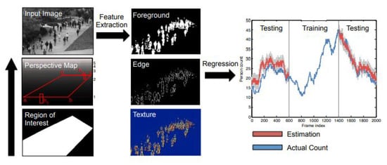 Although counting by detection or part-based approaches achieves reasonable results, it fails in very crowded scenes and under heavy occlusion. Counting by regression tries to mitigate the former problems. Typically, this method consists of two main components. The first component is extracting low-level features, such as Foreground features [], texture [], edge features [], and gradient features []. The second component is mapping in a regression function, e.g., linear regression [], piecewise linear regression [], ridge regression [], or Gaussian process regression, to map the extracted features into counts, as in []. The complete pipeline of this method is shown in Figure 1.