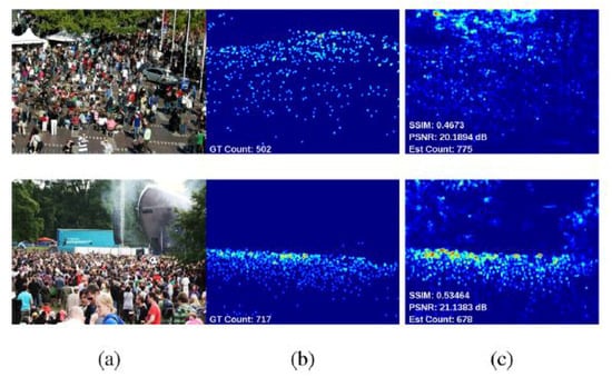 (a) Input image, (b) Ground truth, and (c) Estimated density maps. Image from [].