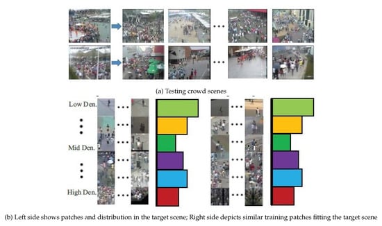 Automatic crowd scene analysis refers to investigating the behavior of a large group of people sharing the same physical area []. Typically, it counts the number of individuals per region, tracks the common individuals’ trajectories, and recognizes individuals’ behaviors. Therefore, automatic crowd scene analysis has many essential applications. It controls the spread of the COVID-19 virus [] via ensuring physical distance between individuals in stores, parks, etc. Securing public events, such as sport championships [], carnivals [], new year celebrations [], and Muslim pilgrimage [], is another application of automatic crowd scene analysis. Crowd scene analysis supplies surveillance camera systems with the abiltiy to extract anomalous behaviors from a huge group of people [,,]. Furthermore, analysis of crowd scenes of public places such as train stations, super stores, and shopping malls can show the effect of crowd path or the shortcomings of the design. Consequently, these studies can better safety considerations [,].