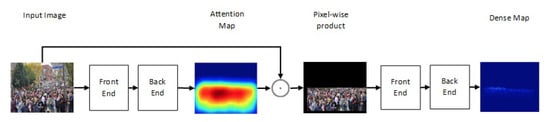 One of the newest state-of-the-art methods for accurate crowd counting came out in []. The authors proposed an attention-injective deformable convolutional network called ADCrowdNet that they claim can work accurately in congested noisy scenes. The network consists of two sections: Attention Map Generator (AMG) and Density Map Estimator (DME). AMG is a classification network that classifies the input image into crowd image or background image. The product of AMG is then used as input to DME to generate a density map of the crowd in the frame. This process is described in Figure 6. ADCrowdNet achieved the best accuracy for crowd counting on the ShanghaiTech dataset [], UCF_CC_50 dataset [], the WorldExpo’10 dataset [], and the UCSD dataset []. In [], Oh et al. proposed an uncertainty quantification method for estimating the count of the crowd. This method is based on a scalable neural network framework that uses a bootstrap ensemble. Method PDANet (Pyramid Density-Aware Attention-based network) [] generates a density map representing the count of the crowd in each region of input images. This density map is generated by utilizing the attention paradigm, pyramid scale features, decoder modules for crowd counting, and a classifier to assess the density of the crowd in each input image. In DSSINet (Deep Structured Scale Integration Network) [], structured feature representation learning and hierarchically structured loss function optimization are used to count the crowd. In [], Reddy et al. tackled the problem of crowd counting by an adaptive few-shot learning. In [], an end-to-end trainable deep architecture was proposed. This approach uses contextual information, generated by multiple receptive field sizes and learning the importance of each such feature at each image location, to estimate the crowd count in input images.